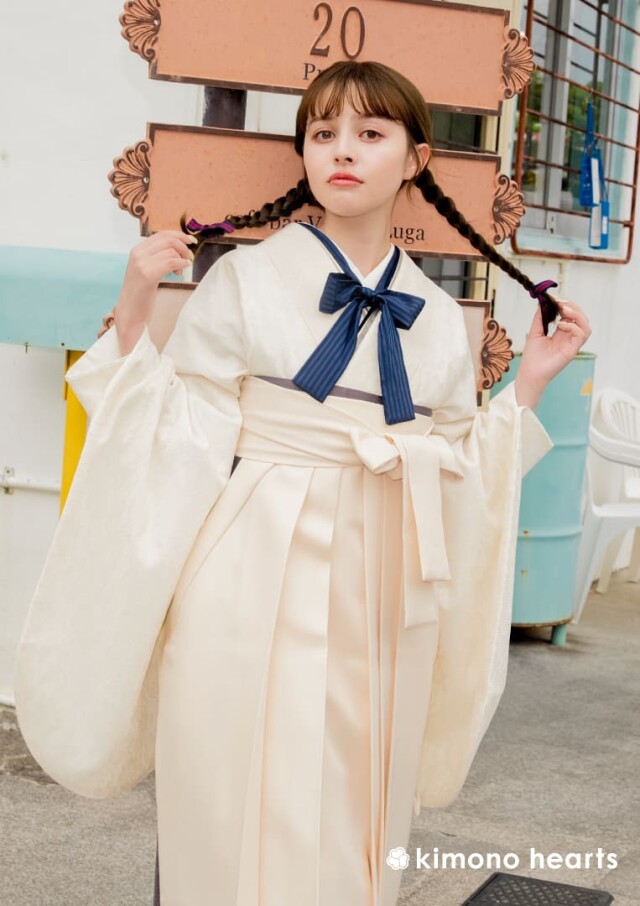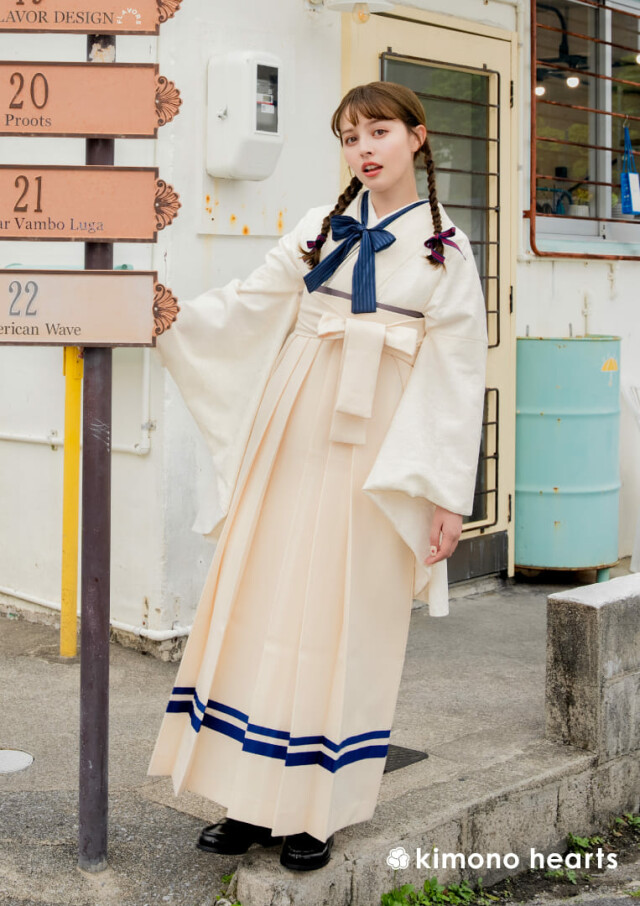 商品説明 | 裾にひかれた青いラインが可愛いキモノハーツオリジナル袴。 白い二尺袖に、青リボンの重衿を合わせました。 爽やかなマリンテイスト風の卒業式スタイル。 |