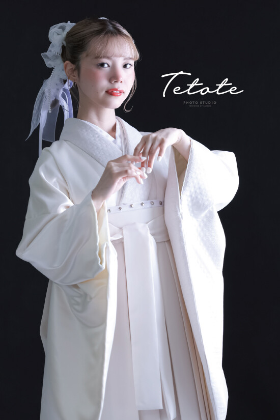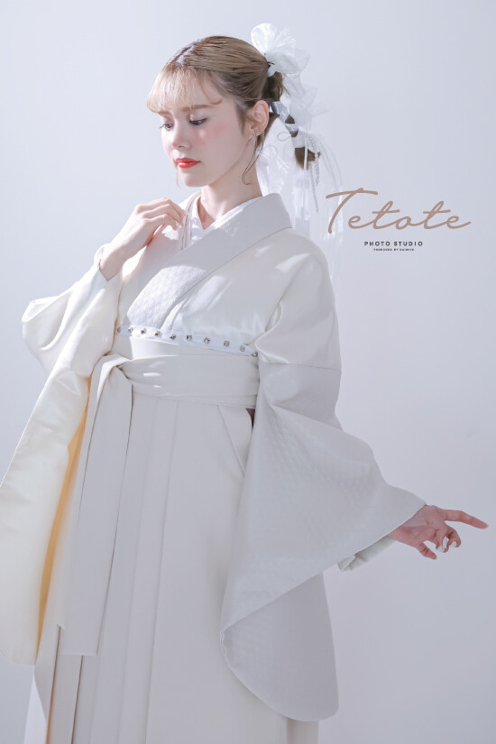 柔らかな白を基調にした、可憐な印象の袴スタイル。足元まで白で統一して、上品なコーディネートに。