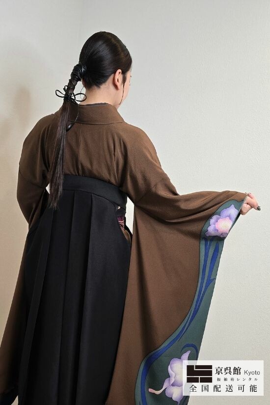 温かみのあるブラウン地に、袖口へ流れるように描かれた紫の花が印象的な一着。