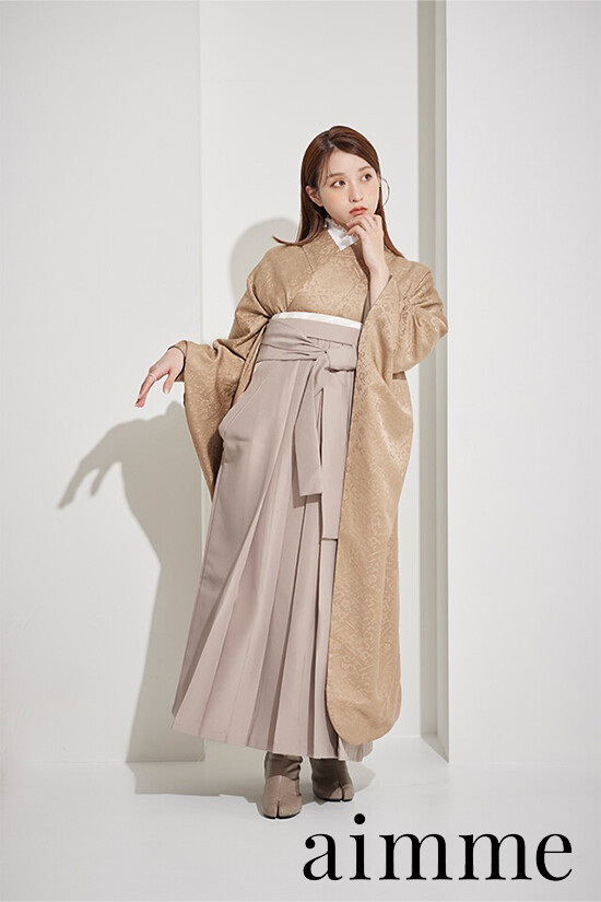 商品説明 | aimmeオリジナルの琥珀×グレージュの袴。首元にはaimmeオリジナルのフリル襟で可愛いさをプラス |