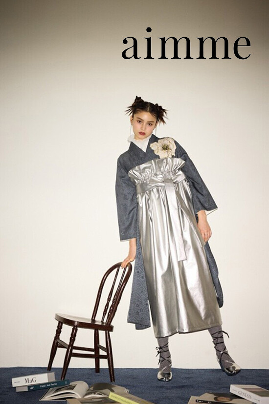商品説明 | トレンドラインのネイビー着物にaimmeオリジナルのmetallic color HAKAMA シルバーをあわせたaimmeらしいコーディネートに。 |
