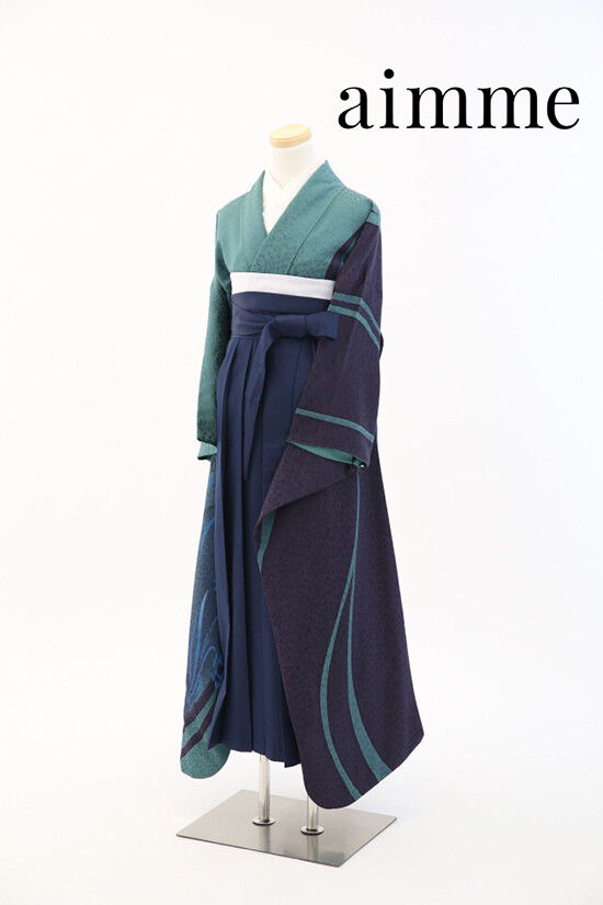 商品説明 | エメラルドグリーンとネイビの色味が入ったヴィンテージ振袖にネイビーの袴を合わせたブルーコーデ |