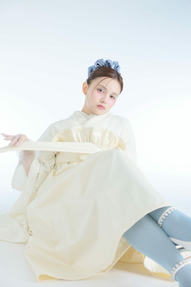 商品説明 | 白の総レース振袖にmetallic color HAKAMAの2025年新色Pearl Whiteを組みあわせたコーディネート |