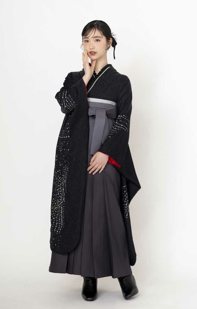 商品説明 | ラメが散りばめられたブラックとグレーの袴でモノトーンコーデ |