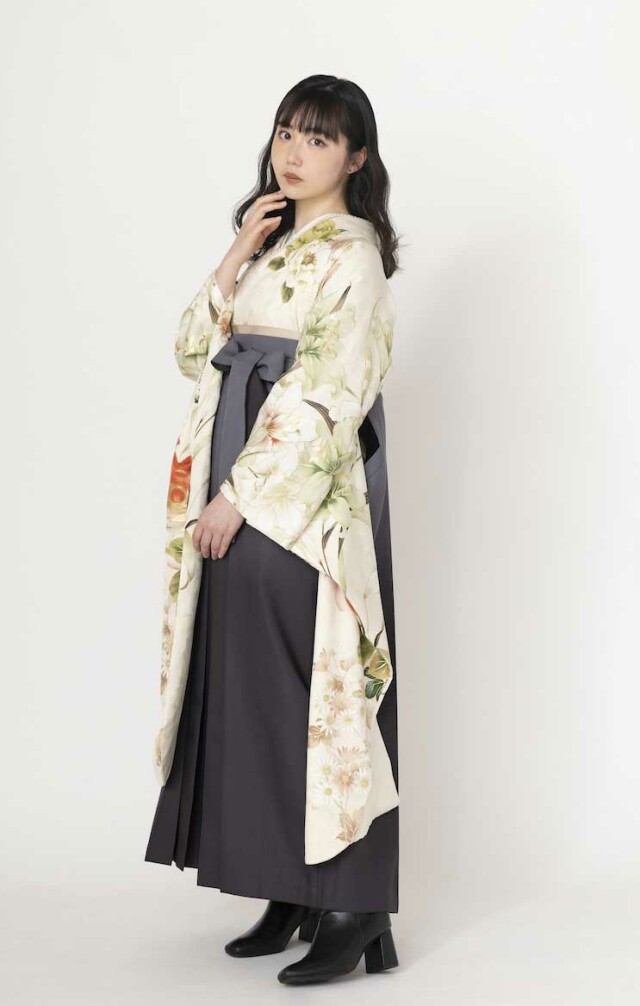 商品説明 | 柔らかいホワイト系の振袖に、グレーの袴のコーディネート |