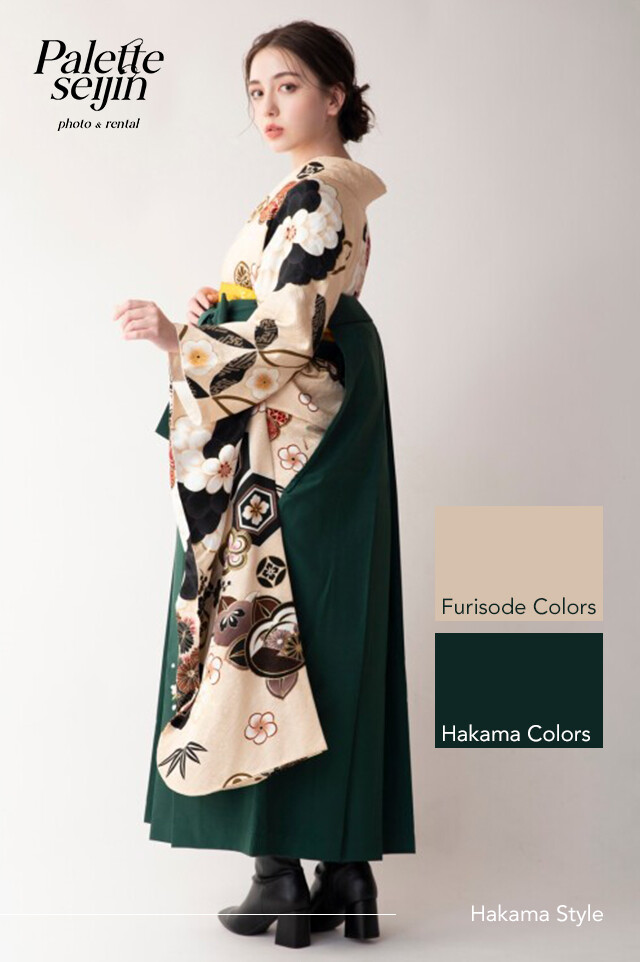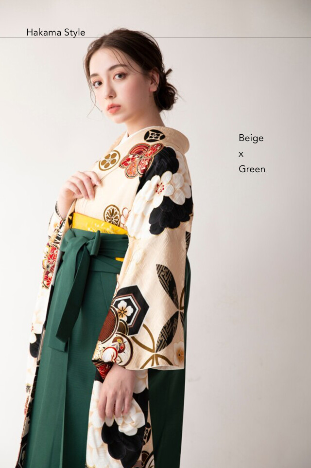 商品説明 | ベージュの現代風のお振袖と緑の袴のコーディネート。 |