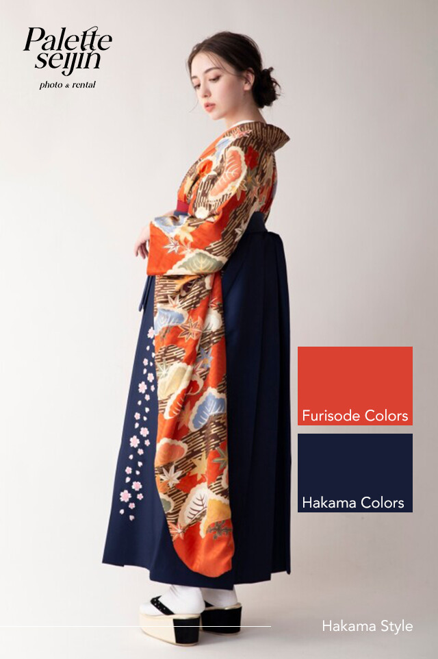 商品形態 | オレンジ色 / 紺色 / 柄あり / 着物/袴セット / 振袖 |