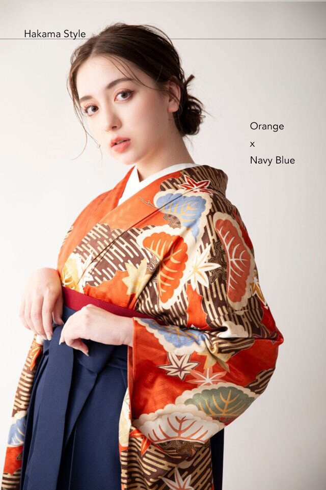 商品説明 | オレンジベースに柄がたくさん入ったお振袖とネイビーの袴をコーディネートしました。 |
