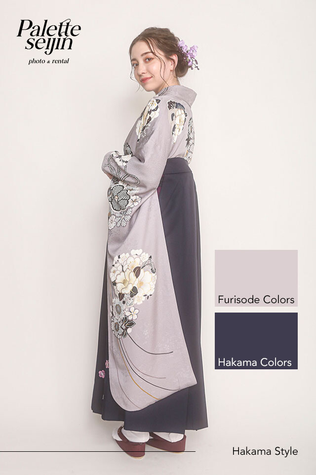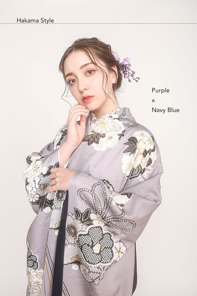 商品説明 | 紫の落ち着いたお振袖に紺の袴を合わせた大人っぽいコーディネートです。 |