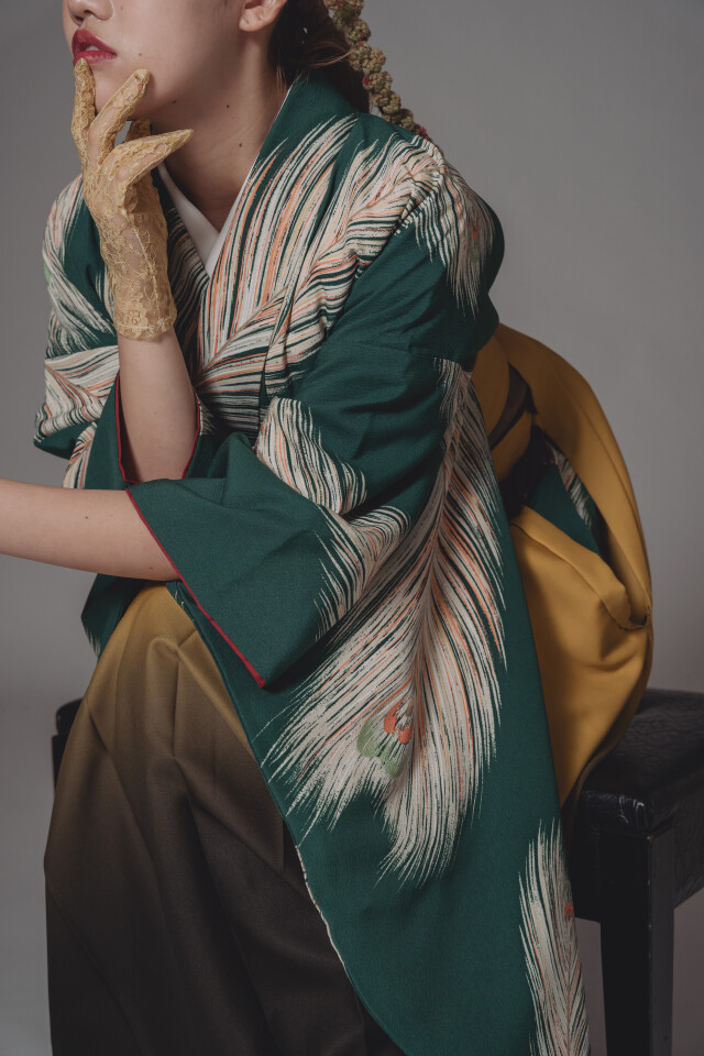 商品説明 | 大胆に描かれたフェザー柄の着物にぼかしの袴を合わせた個性が光るコーディネート |