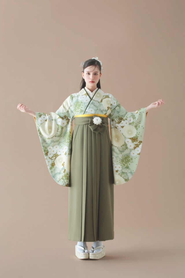 商品説明 | コロンとかわいいフォルムの万寿菊が咲き誇る、かわいい雰囲気の一枚。これから訪れる明るい季節をイメージした『若葉色』は、門出の卒業式にピッタリ。くすみカラーのカーキや、抹茶の袴が相性抜群です! |