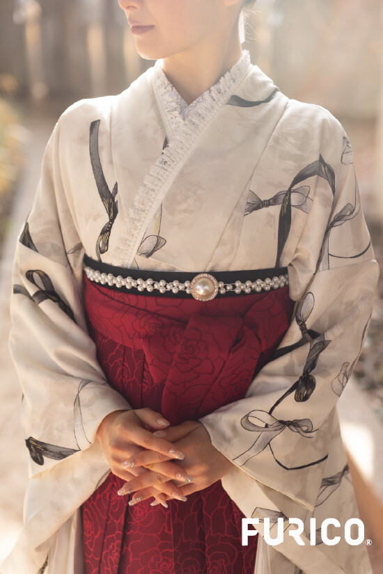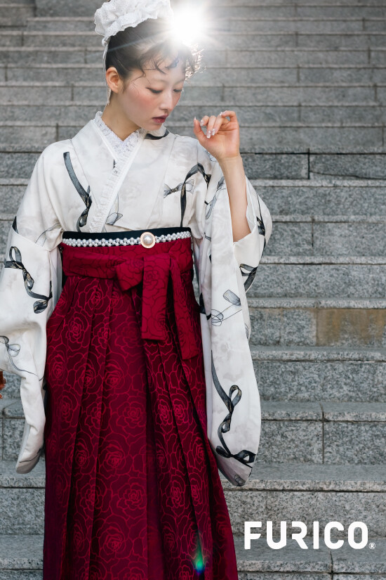 商品説明 | 白地にゆるやかなリボンの柄をまとったモダンな着物に、深みのあるエンジ色の袴を合わせた、クラシカルと現代のMixコーデ。 レトロモダンやアンティークな雰囲気にはパールやレースの小物が相性抜群です。 |