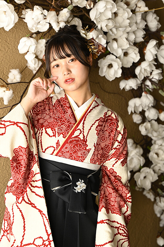 商品説明 | 着物_No.1849 和風館 花鹿の子 クリーム×赤 袴_No.1209A 九重 花古典 黒 |