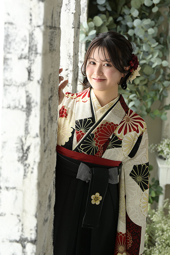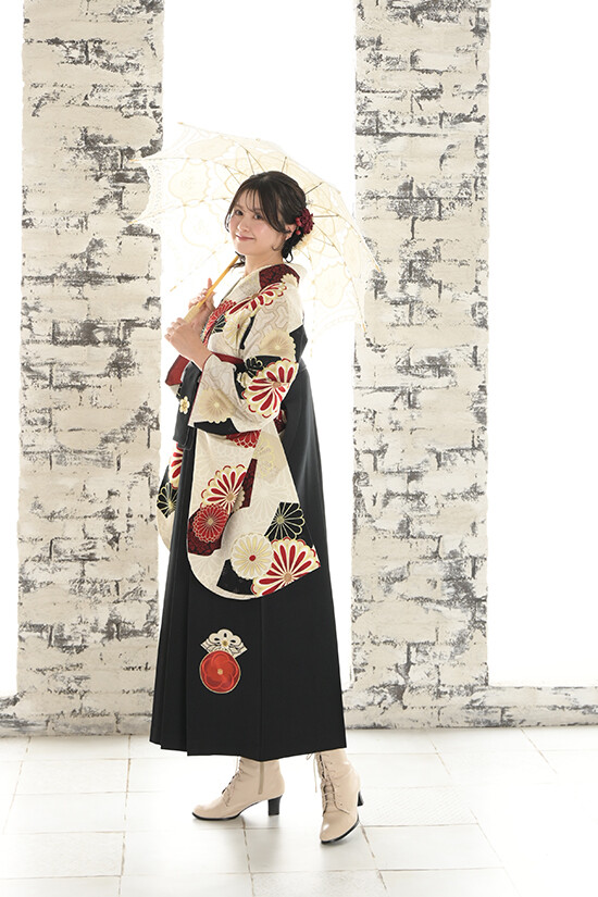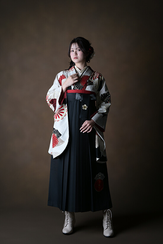 商品説明 | 着物_No.1825 JAPAN STYLE 中村里砂 扇面と菊 ベージュ 袴_No.1221C JAPAN STYLE 中村里砂 梅丸紋 黒 |