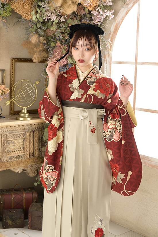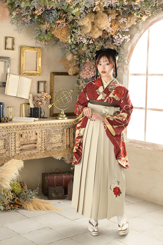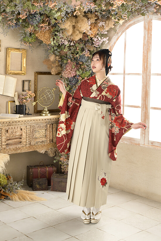 商品説明 | 着物_No.1832 九重 扇面に牡丹 赤 袴_No.1225C 九重 牡丹梅菊 アイボリー |