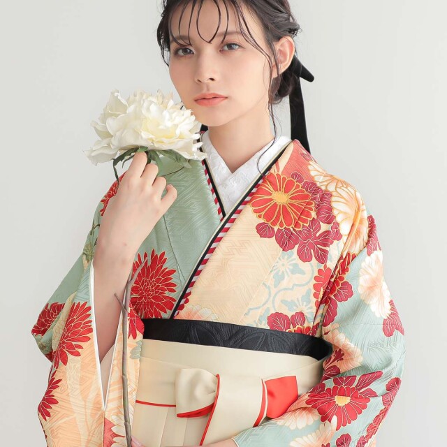 商品説明 | カランコロンとこっぽりの音響く京の街から生まれたブランド「 caran coron」。最高のかわいいをコンセプトに、細部にまでこだわったオリジナリティ溢れるお振袖です。水色に菊に扇面椿を描いた、どことなく大正浪漫を彷彿とさせるアンティークな柄行となっています。 振袖袴着用に必要なものが全て揃った安心のフルセットです。 -セット内容- 振袖/袴/半幅帯/重ね衿/草履・バッグ/長襦袢/肌着/帯板/伊達締め/腰ひも5本/コーリンベルト/衿芯/足袋 ※袴はスカートタイプの仕様です。 |