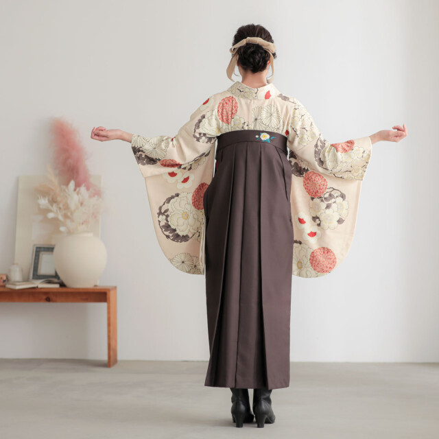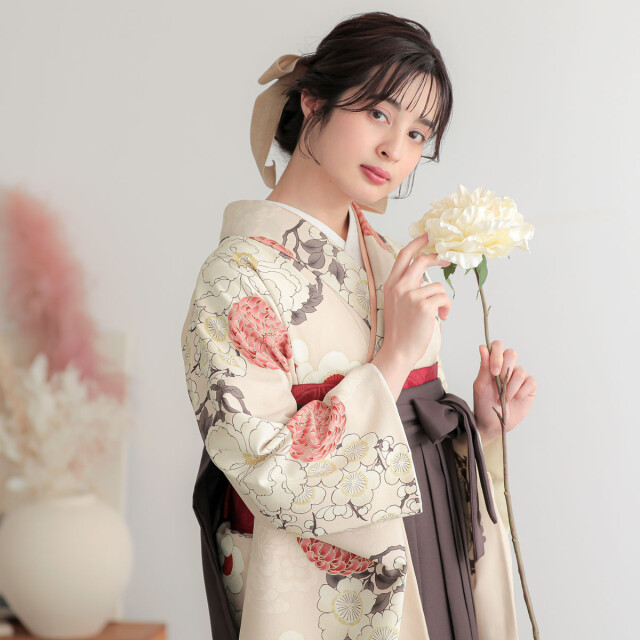 人気ブランド「九重」の二尺用お着物を袴で合わせました。ベージュローゼに大きく描かれた菊や梅の花丸文が華やかで、赤や白の差し色がやわらかな色合いの中にアクセントととなり、落ち着きの中にも凛とした表情を見せます。シックでモダンな雰囲気を好む方にもおすすめのデザインです。