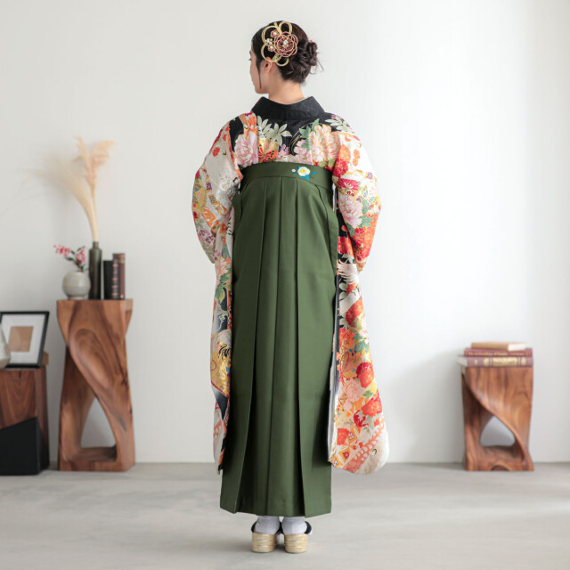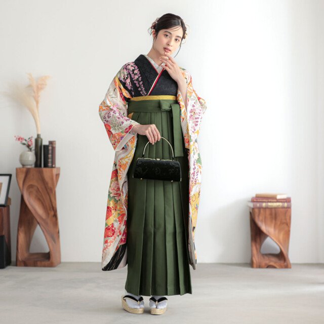 商品説明 | 【高級品 相良刺繍】相良刺繍は、布地の表面に糸を巻きつけて細かい丸い玉のような形状を作り出し、立体感と耐久性を持たせる技法です。色とりどりの花模様が相良刺繍によって立体的に施され、地色が見えなくなるほど華やかに彩られています。伝統的な刺繍技法の魅力を存分に表現した、特別な場にふさわしい振袖袴です。 振袖袴着用に必要なものが全て揃った安心のフルセットです。 -セット内容- 振袖/袴/半幅帯/重ね衿/草履・バッグ/長襦袢(半衿付き)/肌着/帯板/伊達締め/腰ひも5本/コーリンベルト/衿芯/足袋 ※袴はスカートタイプの仕様です。 |