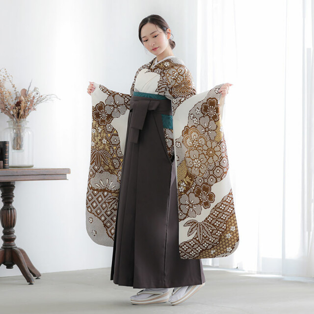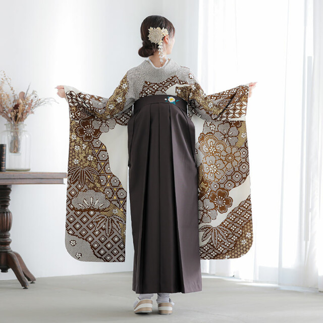 商品説明 | 桜と襷格子のような地模様を疋田風に染めた、松竹梅柄のお着物です。色味は茶色に金とシンプルです。疋田風、または絞り風といえば黒や赤が定番ですが、茶色は珍しく、個性的な配色となっています。 振袖袴着用に必要なものが全て揃った安心のフルセットです。 -セット内容- 振袖/袴/半幅帯/重ね衿/草履・バッグ/長襦袢(半衿付き)/肌着/帯板/伊達締め/腰ひも5本/コーリンベルト/衿芯/足袋 ※袴はスカートタイプの仕様です。 |