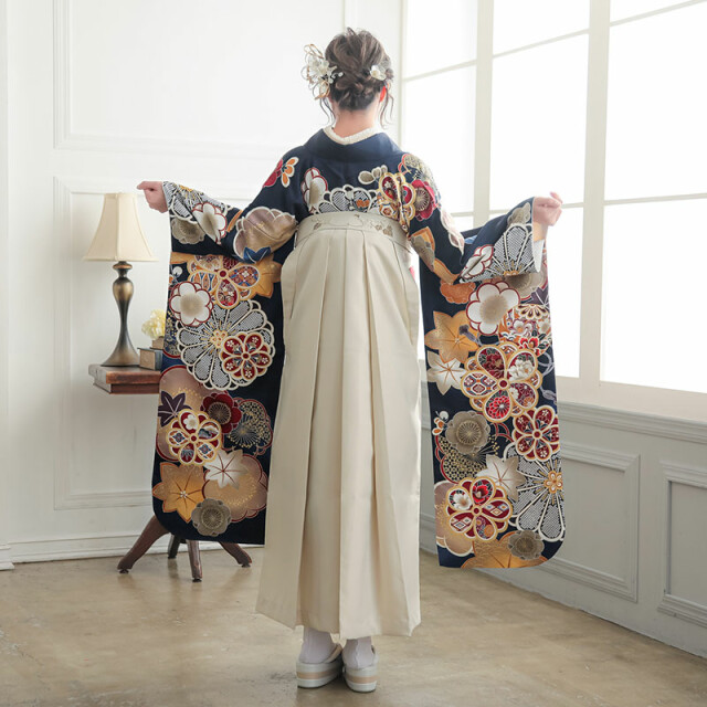 商品説明 | 濃紺地に、梅や楓、手毬大胆に描かれた友禅のお着物です。差し色は金茶や錆赤、くすんだ紫などのくすみカラーで、全体の配色がきれいにまとめられています。柄は古典柄ですが、丸みを帯びた花々のデザインなので、和・様、どちらのコーデでもお楽しみいただけます。 ※標準サイズ・トールサイズあり 振袖袴着用に必要なものが全て揃った安心のフルセットです。 -セット内容- 振袖/袴/半幅帯/重ね衿/草履・バッグ/長襦袢(半衿付き)/肌着/帯板/伊達締め/腰ひも5本/コーリンベルト/衿芯/足袋 ※袴はスカートタイプの仕様です。 |