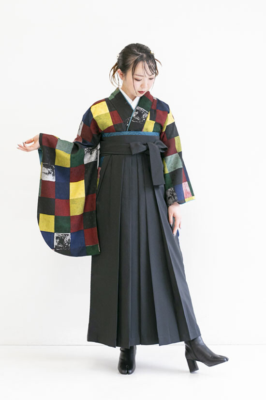 商品説明 | モダンな幾何学模様の着物に黒を合わせたクールな卒業袴コーディネート。 |