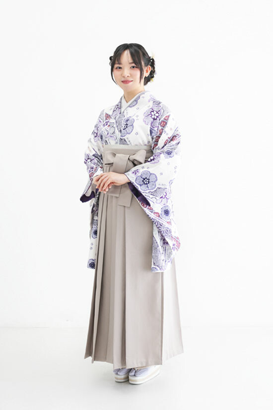 商品説明 | 絞りの花模様の白い二尺袖にベージュの袴を合わせた今っぽさのある古典的な卒業袴コーディネート。 |