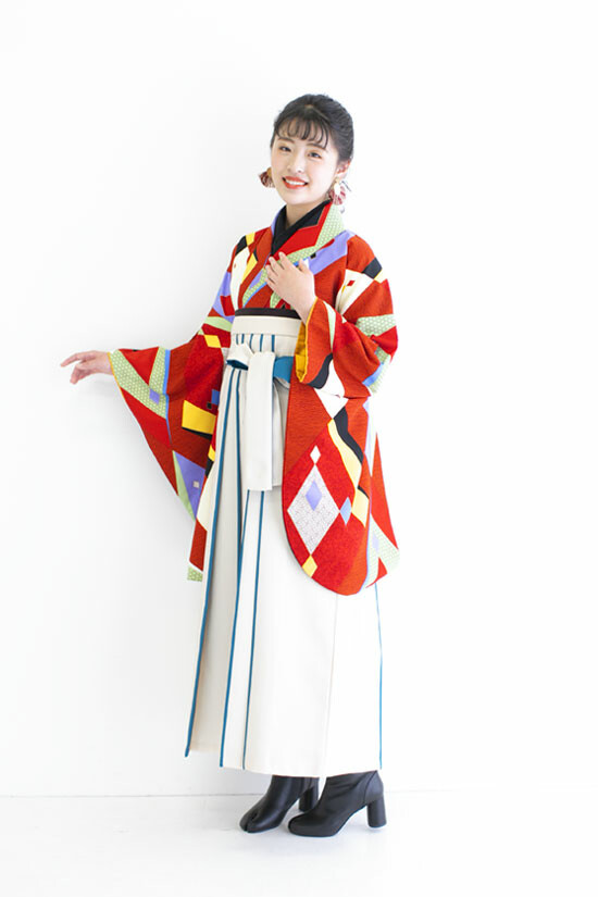 商品説明 | 幾何学模様の赤い二尺袖に白い袴を合わせたスタイリッシュな卒業袴コーディネート。 |