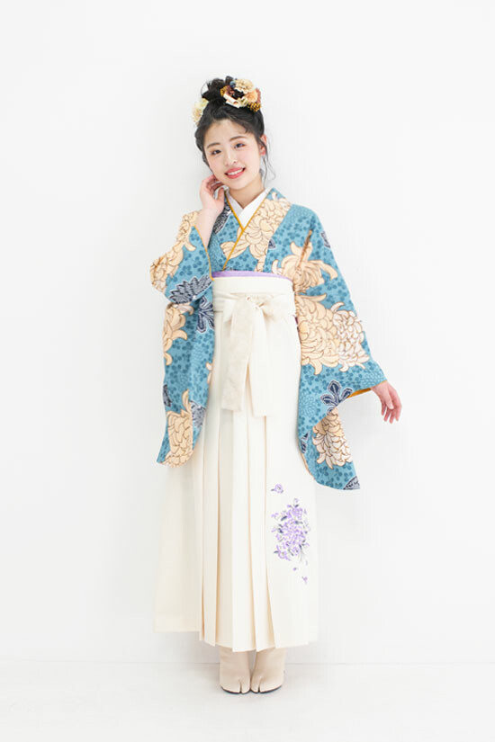 商品説明 | 水色の菊柄の二尺袖に白い袴を合わせたさわやかでモダンなコーディネート。 |