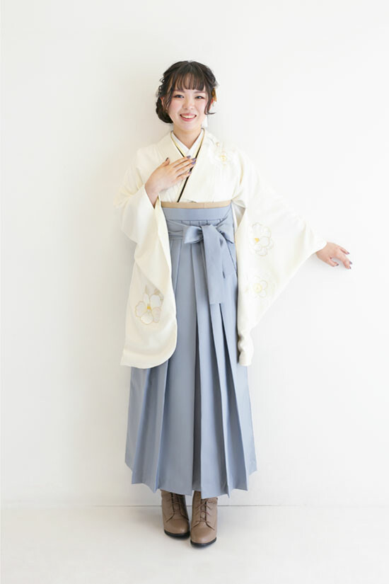 商品説明 | 真っ白な椿の刺繍の二尺袖にブルーグレーの袴を合わせた都会的な洗練された卒業袴コーディネート。 |