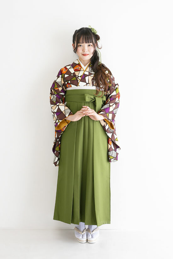 商品説明 | 茶色のステンドグラス柄に抹茶色の袴を合わせたオシャレな卒業袴コーディネート。 |