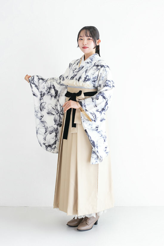 商品説明 | 墨模様の二尺袖にオフホワイトの袴を合わせた洗練された卒業袴コーディネート。 ウエストのチュールフリルはオプション。 |