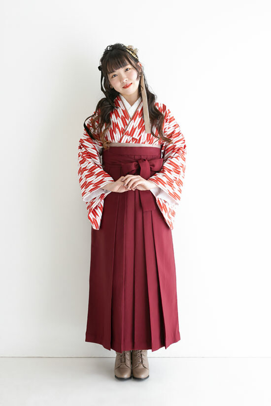 商品説明 | 赤い矢羽柄の二尺袖にエンジ色の袴を合わせた大正ロマン的な卒業袴コーディネート。 |