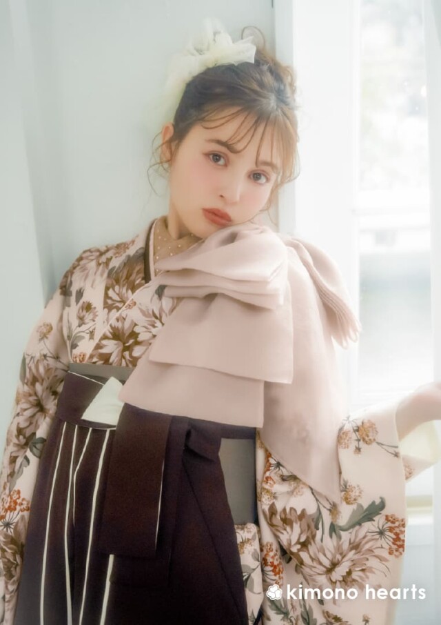 商品説明 | ベージュ地に洋花が舞うガーリーな二尺袖。 愛らしさ満点の卒業式スタイルです。 大きなリボン(別売)を肩に飾ってもすてき! |