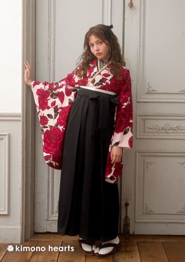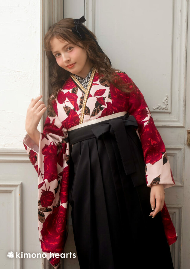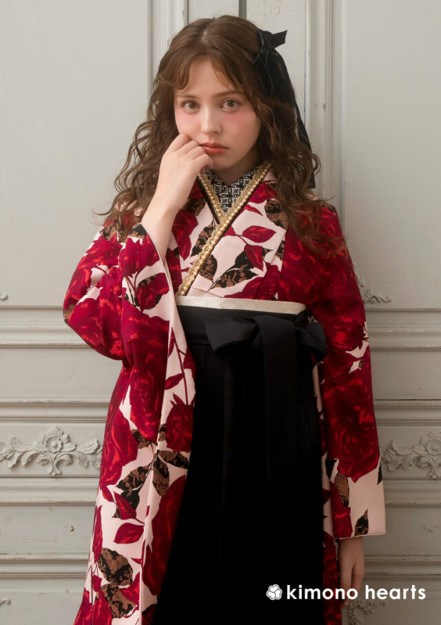 商品説明 | 淡いピンク地に咲くたくさんの真紅の薔薇が印象的な二尺袖。 黒の袴を合わせることで、甘さの中に凛としたムードが生まれます。 ゴールドのフリルレースとパールが付いた重衿を添えて、華やかなきらめきをひとさじ。 より可憐で存在感のある装いに。 卒業式の日は、まるでヨーロッパのお人形のように。 夢みる気分をぎゅっと抱きしめて、一生の思い出になる特別な一日を迎えてください。 |