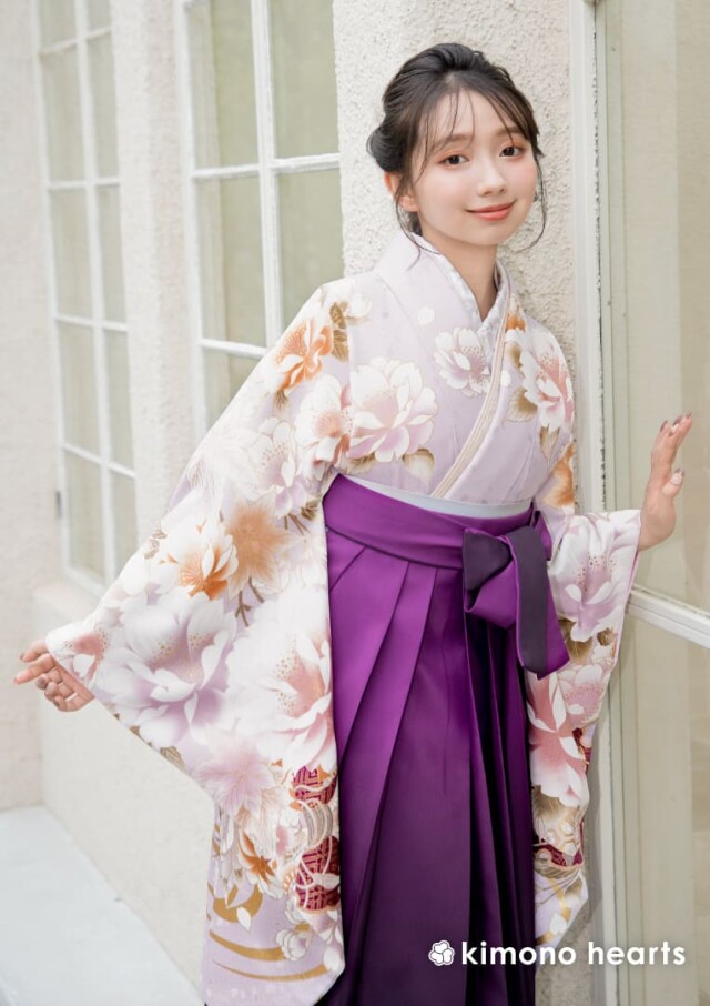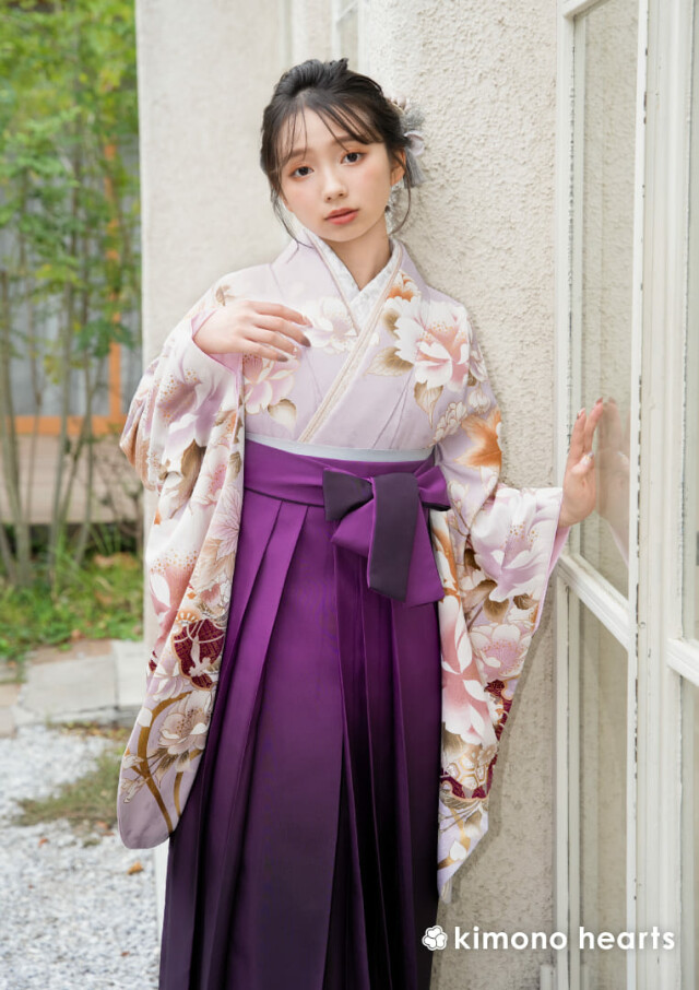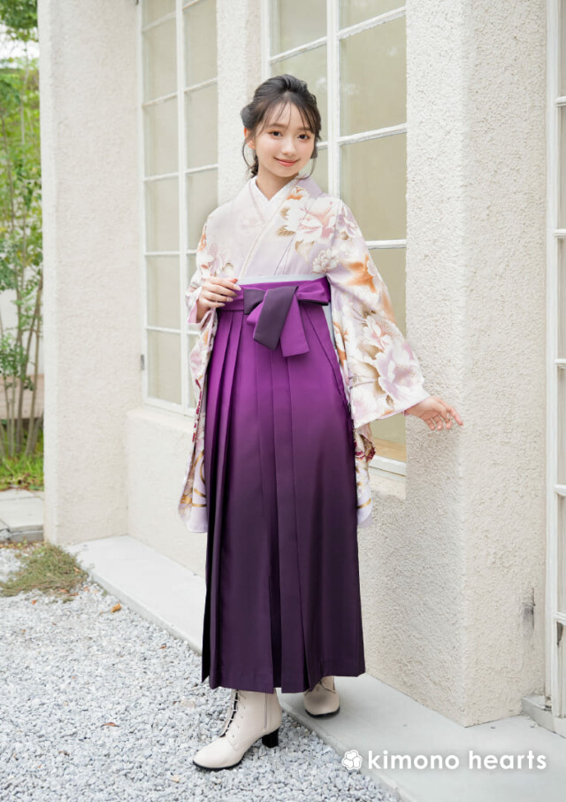 商品説明 | 花柄が描かれた淡い藤色の二尺袖に、グラデーションが美しい紫の袴をコーディネート。 上品な雰囲気漂う卒業式の装い。 |