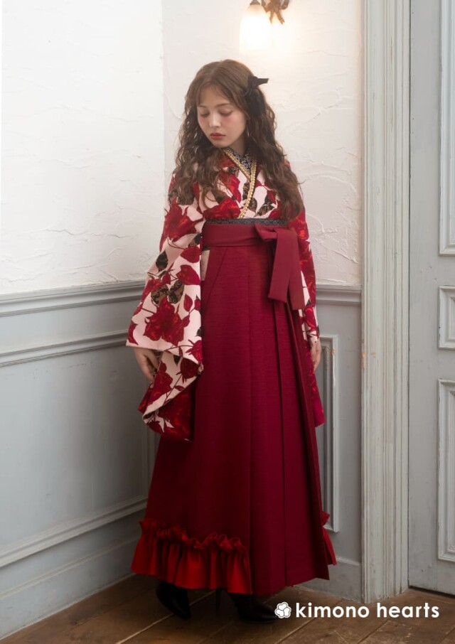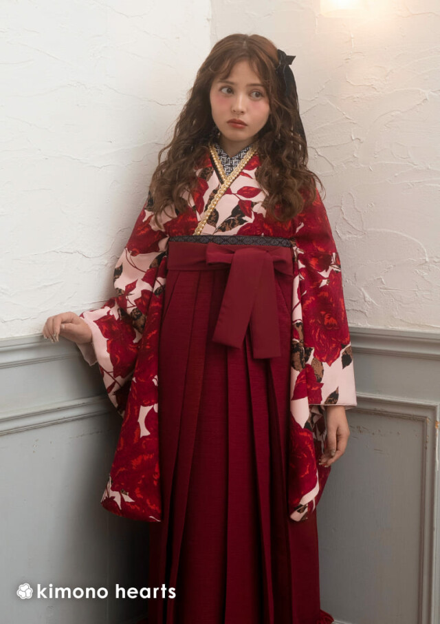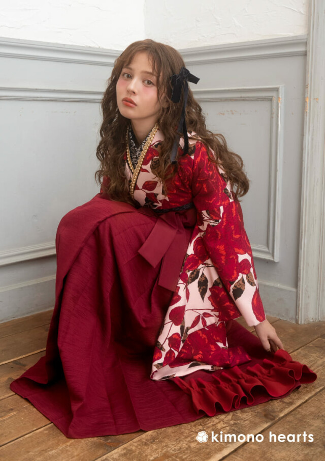 商品説明 | 淡いピンク地に咲くたくさんの真紅の薔薇が印象的な二尺袖。 裾にフリルが付いた赤の袴を合わせました。 ロマンティックな気分で纏いたい、誰よりもキュートな卒業式スタイル。 |