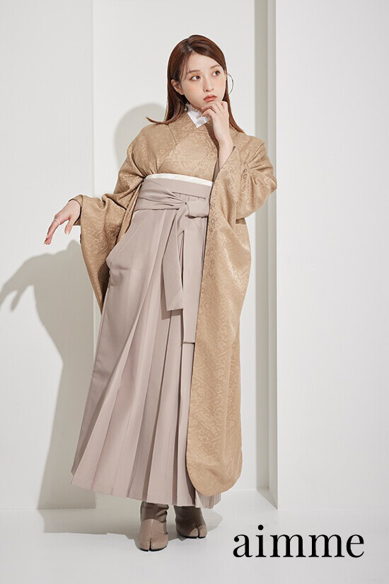 商品説明 | aimmeオリジナルの琥珀×グレージュの袴。首元にはaimmeオリジナルのフリル襟で可愛いさをプラス |
