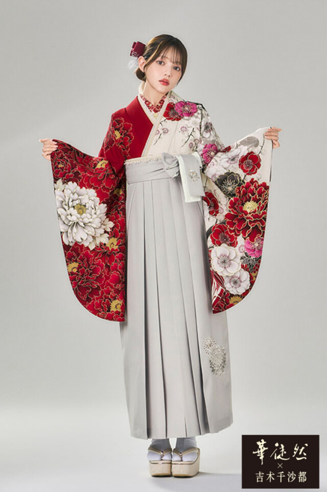 商品名 | 華徒然×吉木千沙都ブランド袴ネットレンタル 白赤 牡丹柄 人気 片身替わり 正統派古典 清楚 王道 R27042 |