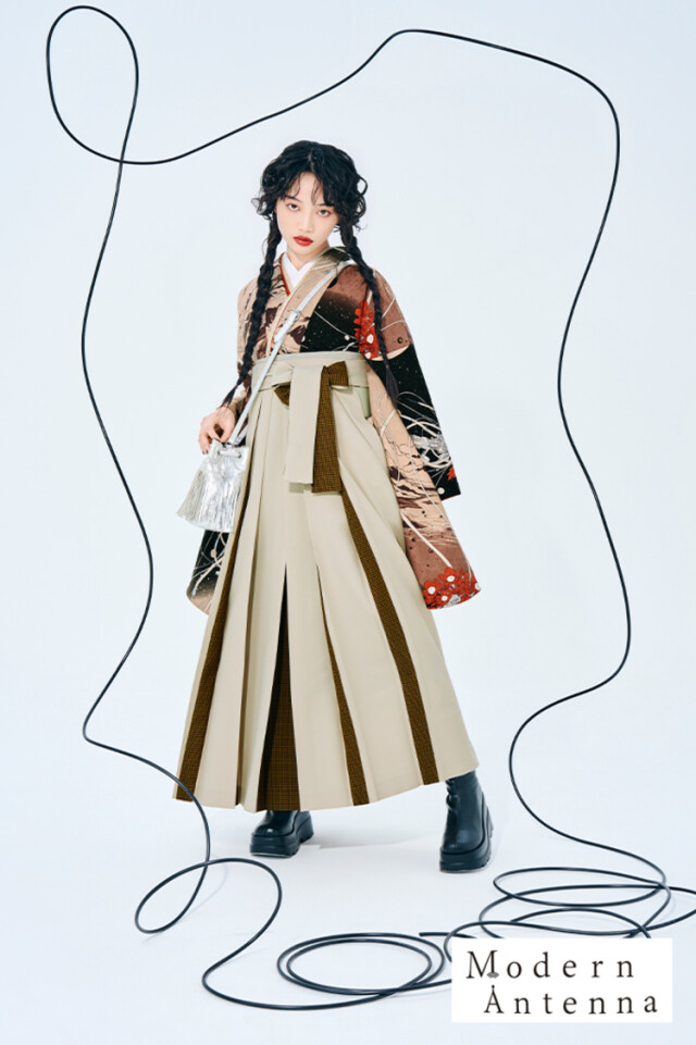 商品名 | モダンアンテナブランド袴ネットレンタル 黒/ベージュ 夜空と花とケーブル レトロ 人と被らない袴 ブーツスタイル R27036 |