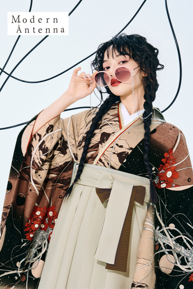 商品説明 | 【個性的袴の代表格modern antenna】 (レトロモダン/個性的袴/人とかぶらない袴/お洒落袴/大正ロマン) 「有機と無機が織りなす風景」 ~夜空と花とケーブル~ 静寂な夜空と山脈を背景に、ケーブルで世界に接続された一輪の花。自身の才能が新たな環境に繋がり、広大な未来へと羽ばたく瞬間を描写しています。絡み合うケーブルは、新たな繋がりや出会いへの期待を象徴しています |