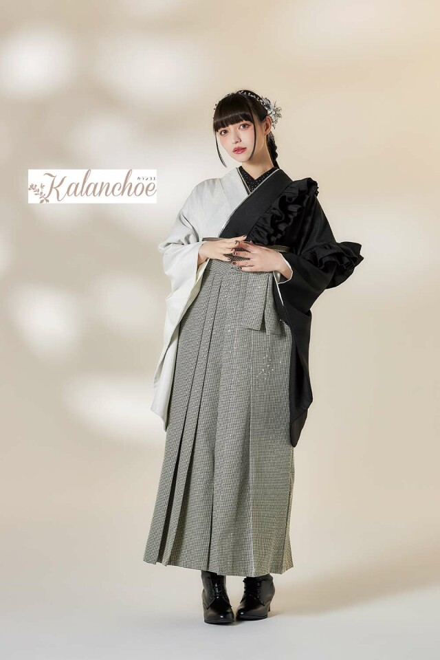 商品説明 | 白/黒のバイカラーの二尺袖に肩と袖にに斜めフリルをあしらった新しい形の着物です。 |