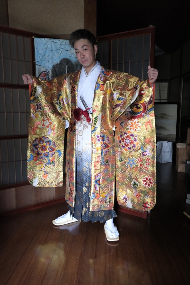 商品説明 | 誰よりも目立ちたい袴男子にオススメします。 色打掛を陣羽織にリメイクしたオリジナル紋付セットです! 当店の古民家レトロスタジオで写真撮影します。 |
